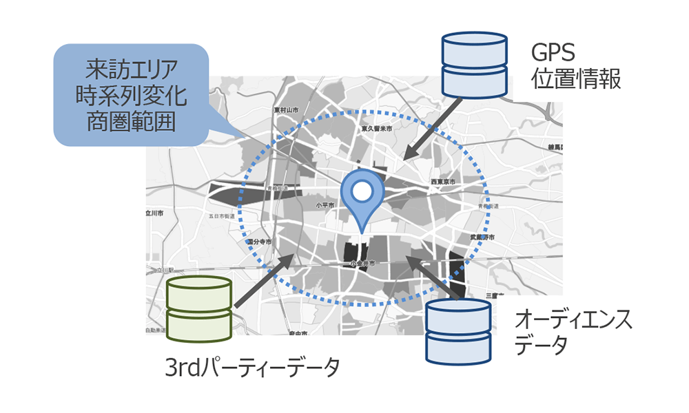 店舗分析時に用いるデータとして、売上や客数に加えて、従来からの公的統計データ(周辺人口など)だけではなく、GPS位置情報を用いてタイムリーに店舗の状態変化を察知し対策を打つことができます。