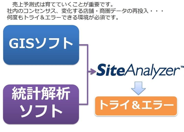 予測モデルを向上させるためには、売上を説明する要因が何かを探索的に見つけ出していく作業が必要です。統計解析ソフトとGIS(地図情報システム)の2つのツールを利用するのが一般的ですが、重回帰分析機能を搭載したGIS(地図情報システム)「SiteAnalyzer™」を用いれば、1つのシステムで重回帰モデルを構築することができ、トライアンドエラーが簡単に行えるようになっています。
