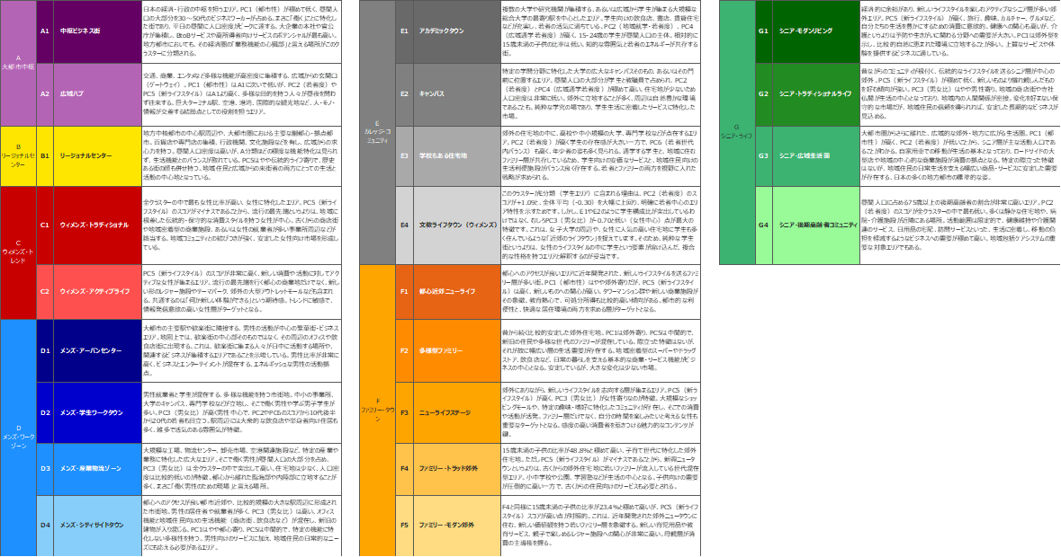 30の初期クラスターでは細かすぎるため、特徴が似ているグループを統合し、より実用的な22の小分類クラスターに再編しました。さらに、それらを大きな共通点で括り、A~Gの7つの中分類(類型)を定義。それぞれに「大都市中枢」「カレッジ・コミュニティ」といった、その本質を表す分かりやすい名称を付与しました。