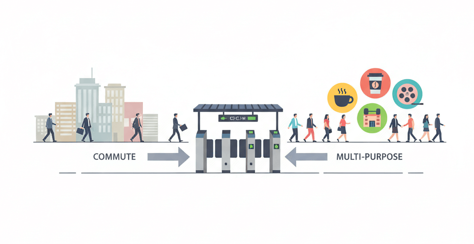 しかし、その回復の内実は、コロナ禍以前とは大きく異なっています。最も大きな変化は、リモートワークやハイブリッドワークの定着によるものです。これにより、従来の「平日の朝夕に集中する通勤ラッシュ」という画一的な利用パターンは崩れ、人々の駅利用はより多様化・平準化しています。