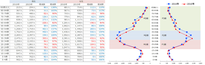 エリア内で人口の流入・流出がない場合は、先の35~49歳の世代と同様に2010年の折れ線が同じ波形で5年分上にシフトするはずです。しかしグラフの波形が重なっているということは、他のエリアからその世代の人(20代~30代)が流入してきたことを意味します。