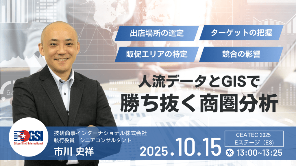 技研商事インターナショナルは、「パートナーズ&グローバルパーク」エリアの一般社団法人LBMA Japanブース内に出展し、公的統計データや人流データ、その他多様なデータを地図上に可視化し、エリアマーケティングを最適化するソリューションをご紹介します。